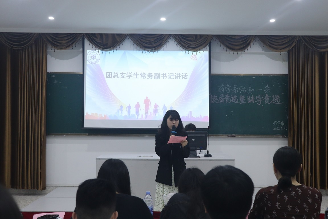 为保证有足够高素质的后备力量,充分发挥学生的主体作用。药学系新一届“两委一会”干部换届竞选活动于2022年5月25日17:30在综合楼阶梯二教室举行。出席本次活动的有药学系团总支副书记鲍佳佳老师、辅导员林玫老师、吴爱琴老师以及两委一会的所有成员。