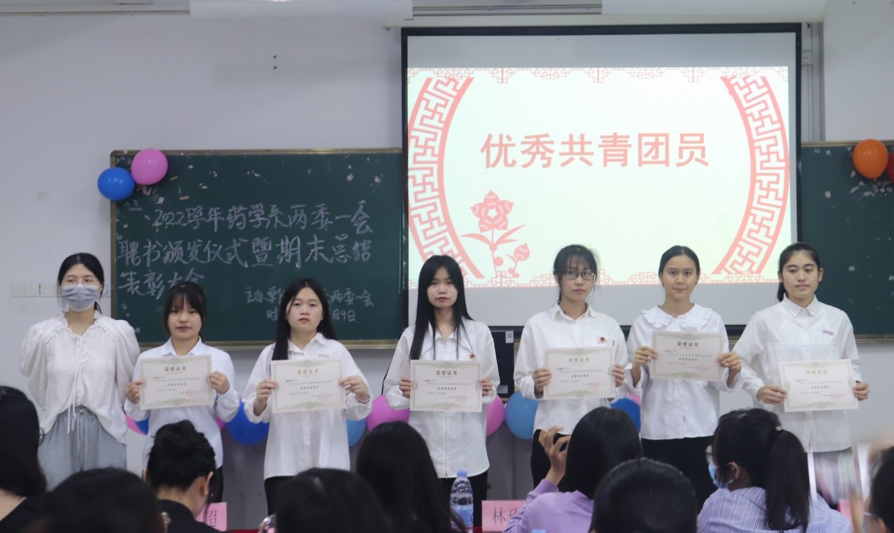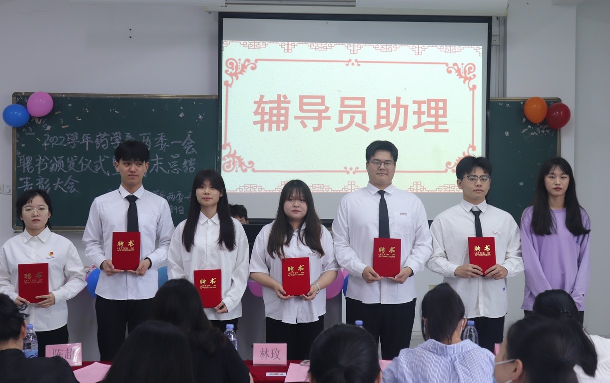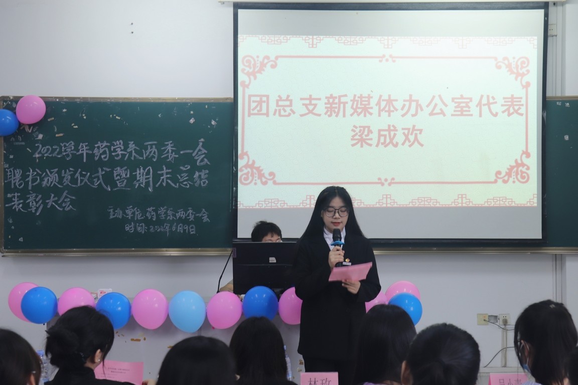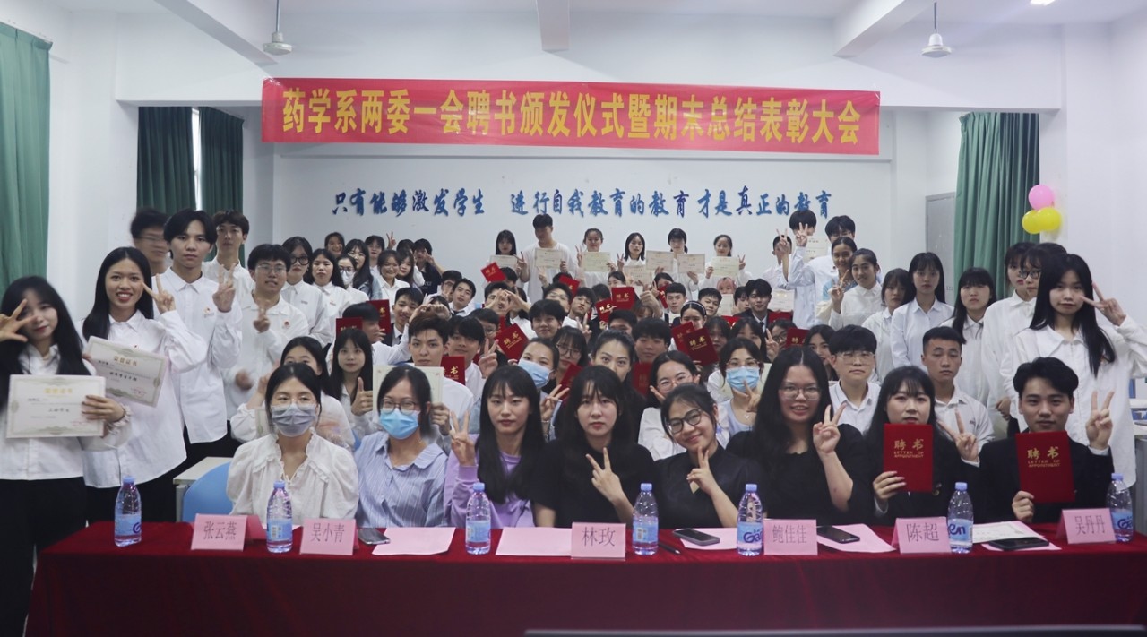 2022年6月9日下午2:40药学系于阶梯三(219)教室进行两委一会聘书颁发仪式暨期末总结表彰大会。出席本次活动的嘉宾有药学系团总支副书记鲍佳佳、辅导员林玫以及药学系的其余任教老师们。由谢建辉、冯晓莉同学主持本次表彰大会。