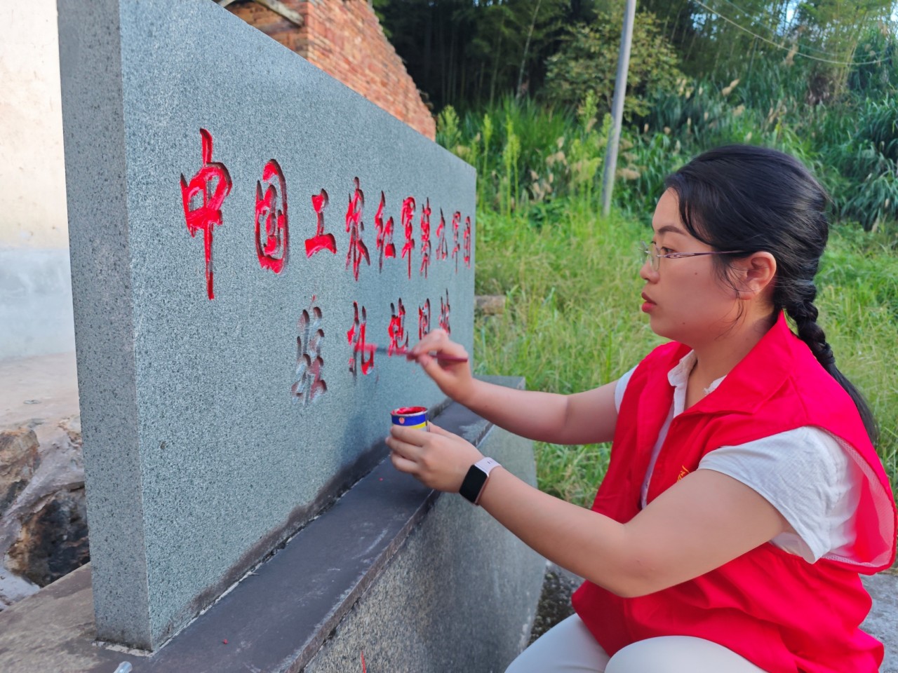 光裕堂门口刻有“中国工农红军第九军团驻扎地旧址”的石碑碑文红漆已脱落不显,师生们自发购买红漆和毛笔,将石碑碑文一笔笔悉心勾勒,指尖触碰着凹凸的石刻纹路,也触碰到了红色精神的传承脉络。补绘全程,师生们始终以普通话为纽带,将语言与红色文化紧密相连,用规范的话语解读“红色血脉”的时代内涵,分享光裕堂红色故事里的初心使命。正是这样的结合,让红色文化有了“听得懂、传得开”的载体,为红色研学与乡村旅游发展注入动能。
