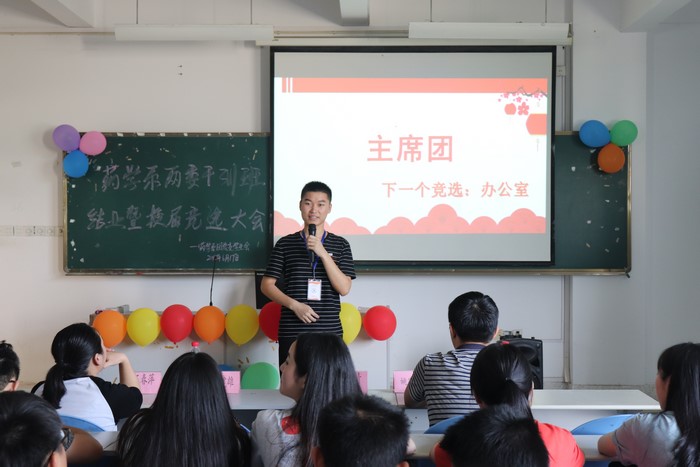 6月17号下午三点半由药学系举办两委干训班结业暨学生干部竞选大会在阶梯三教室正式举行,本次大会到场的嘉宾分别有党支部书记郑爱清老师、辅导员王春萍老师、辅导员姚冠华老师、大二学生干部以及两委的干事们。