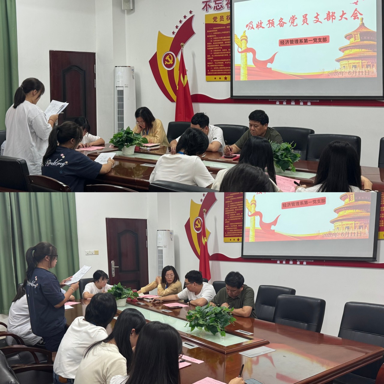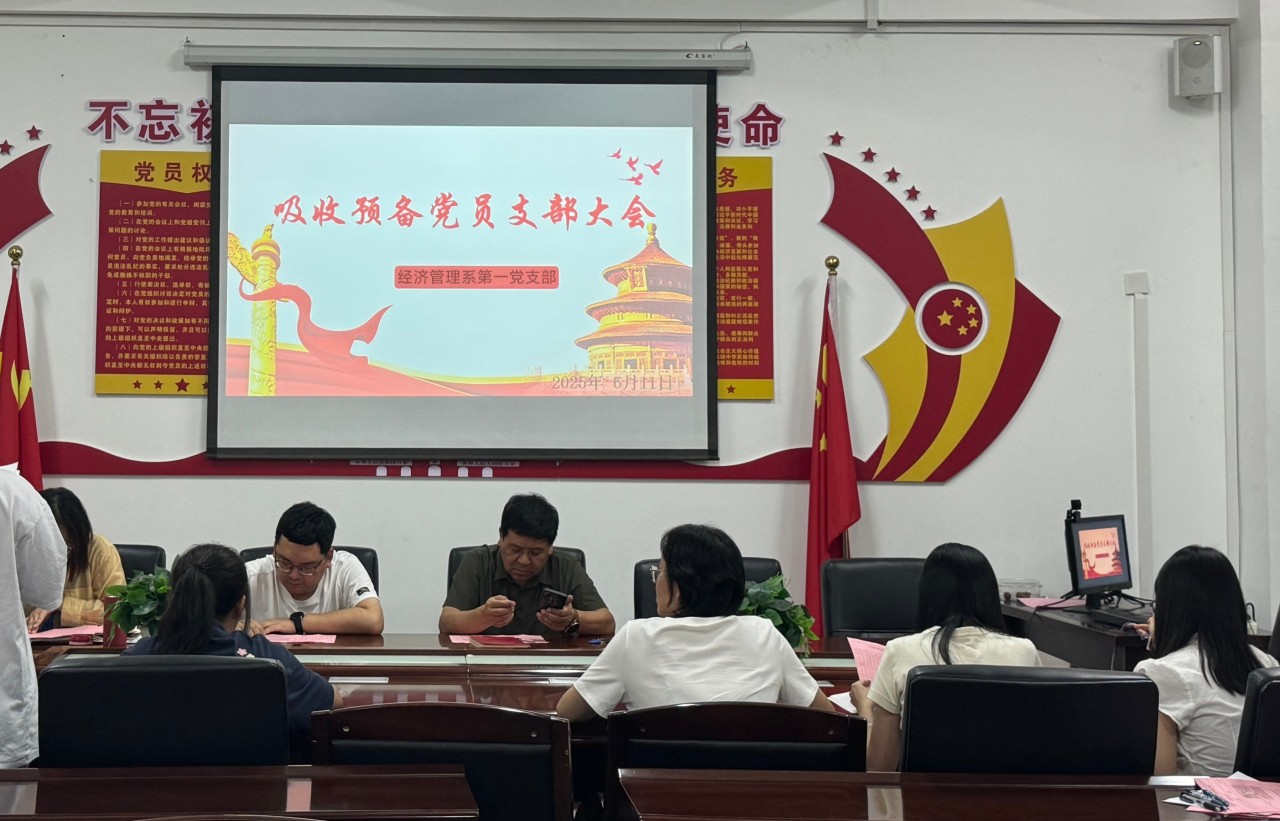 为加强党员队伍建设,注入新鲜血液,2025年6月11日下午,经济管理系第一党支部在L楼党建活动室召开吸收预备党员大会。支部全体师生党员参会,会议由支部书记孙丽平同志主持。