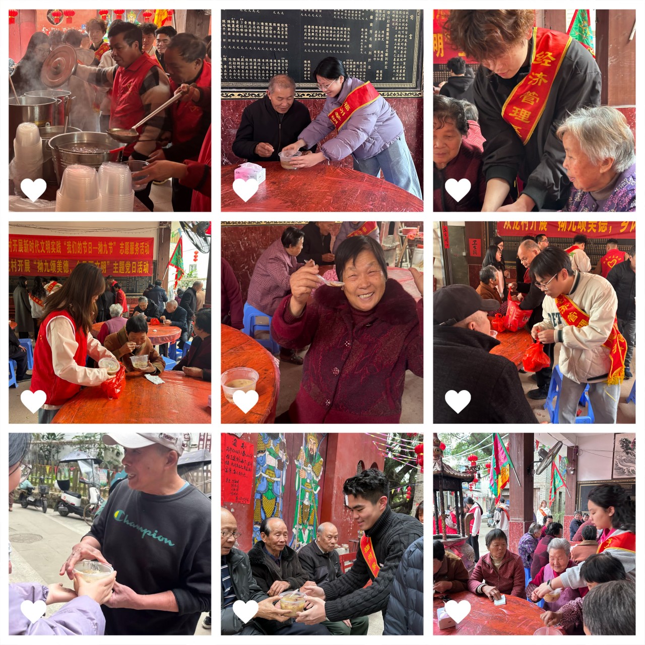 一碗福粥,传递浓浓温情。活动当天清晨,志愿者们早早到达村老人活动中心桌椅摆放整齐,为老人们营造温馨舒适的氛围。当老人们陆续入座,志愿者们端上一碗碗精心熬制的拗九粥 —— 糯米软糯、花生香甜、红枣点缀,热气氤氲中承载着满满的敬意与关怀。“阿公阿婆,慢一点喝,小心烫”,一句句真挚的问候、一个个贴心的举动,让老人们脸上洋溢着幸福的笑容。随后,志愿者们还为老人们准备了精彩的文艺表演,欢快的旋律与老人们的欢声笑语交织在一起,活动现场暖意融融,温情涌动。