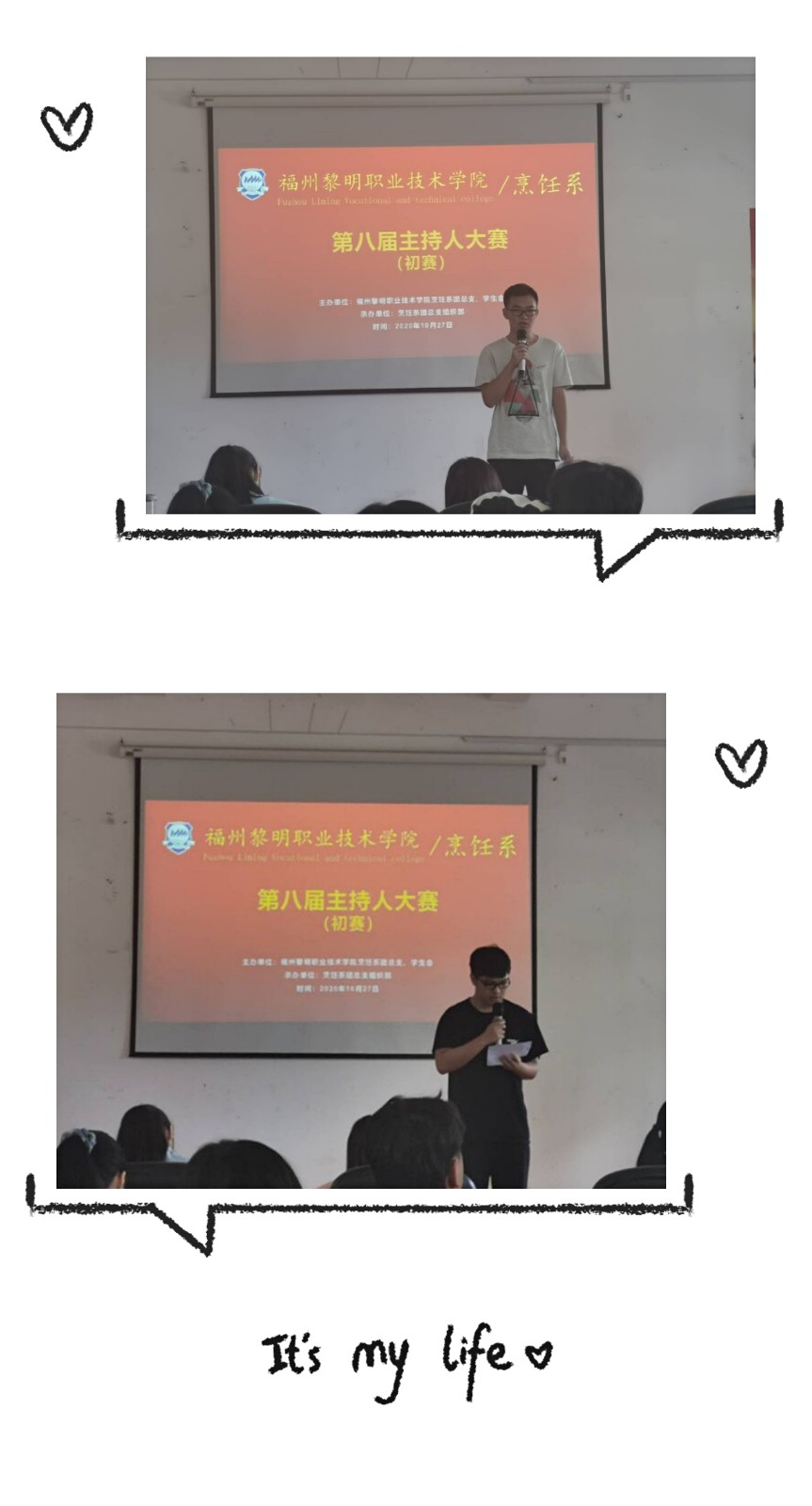 此次大赛共分为四个环节,分别为选手亮相,自我展示,模拟主持,我主持我精彩。选手们亮相十分精彩,一个个精神十足。自我展示为我们带来了天气预报,新闻联播,娱乐新闻等。模拟主持为我们带来了各种主题掌声不断。参加本次大赛的选手们展示了自己的主持功底,良好的台风,也向我们展示了他们积极向上的精神。他们时而成熟稳重,时而活泼幽默,时而激昂慷慨的表演,现场的气氛逐渐升温,掌声连连。