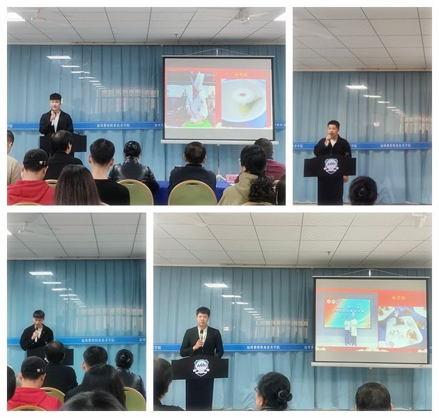 此次分享会是在烹饪系连续三年获得福建省高职院校职业技能竞赛第一名的背景下召开的。分享会首先由四位省赛选手分享他们参赛的心路历程。其中,作为队长的张艳超同学提到今年的技能大赛集训得到学校大力支持,在实训场地安排、实训设备购置和实训材料保障都给予足够的支持。他表示非常感谢学校给予的这次平台。第一次参加比赛的王佳悦同学,也感慨道团队配合的力量,在训练过程中和比赛的时候都离不开三位学长的帮助,学长们一步步教会他制作方法,一遍遍教他如何处理细节,精益求精。有多次比赛经验的林崇炤同学提到在日常的训练和大小技能比赛后,我们都会进行深入总结,寻找不足,提出解决办法或策略,以取得下一次的提高。赛手们的分享也给在座的同学很深的启发。