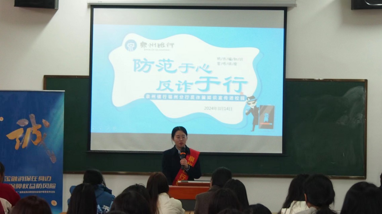 伴随着信息技术的不断进步,电信诈骗案件频频发生,各种新型电信诈骗犯罪形式层出不穷。为加强学生对电信网络诈骗的防范意识,提高自我保护的能力,减少校园内的诈骗案件。2024年3月14日下午,福屿校区邀请到了泉州银行福州分行的工作人员,为同学们开展防诈骗安全教育主题讲座。