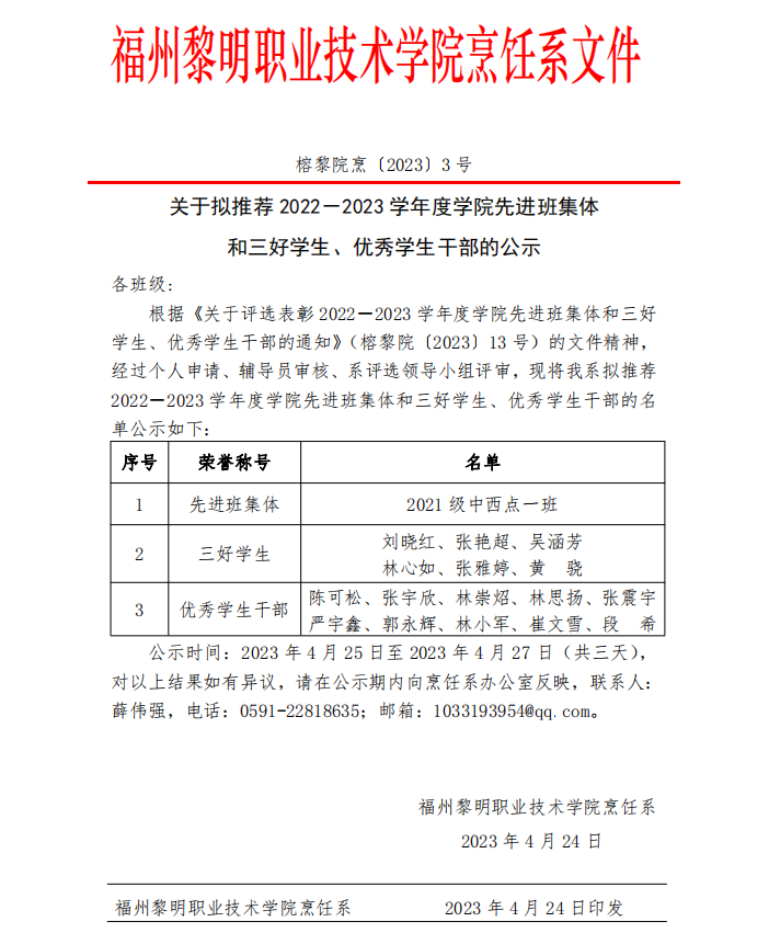 关于拟推荐2022-2023学年度学院先进班集体 和三好学生、优秀学生干部的公示