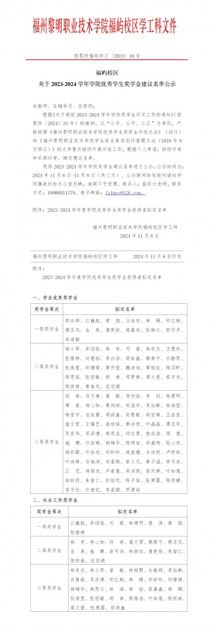福屿校区关于2023-2024学年学院优秀学生奖学金建议名单公示