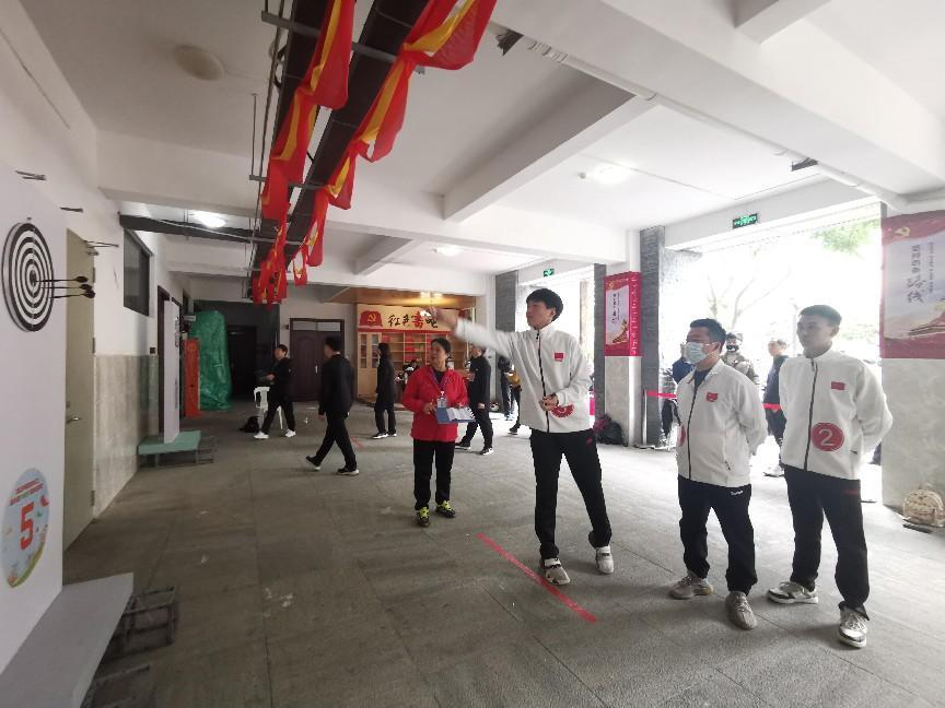 参加飞镖赛的选手屏气凝神,瞄准靶心精准投出每一支飞镖;插秧收割比赛时,队员们身姿矫健、步伐灵活而沉稳,一次次准确插入潇洒拔出;旱地龙舟,六名队员齐心协力以脚为浆操控着龙舟稳步向前,喊着口号向终点冲刺。