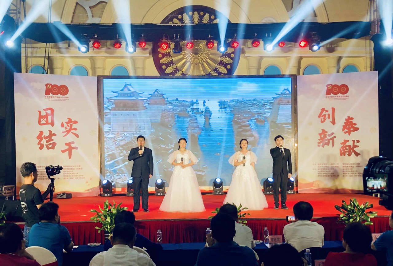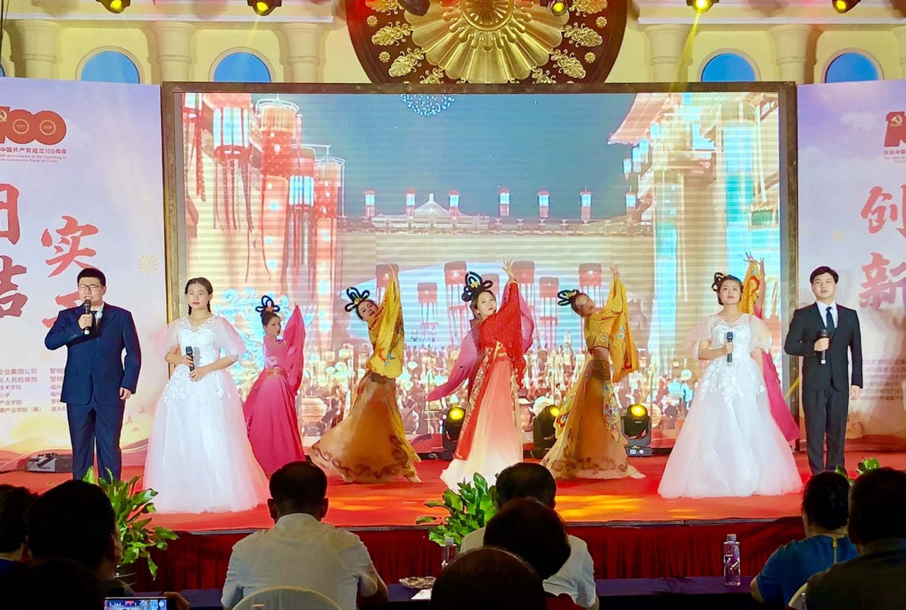 6月28日上午,福州五洲佳豪酒楼,黎明集团属下各教育产业单位隆重举行庆祝建党百年文艺汇演。读者协会与曼奇立德动漫产业学院合作的音舞诗画节目《唐诗里的中国》也代表学院参演。