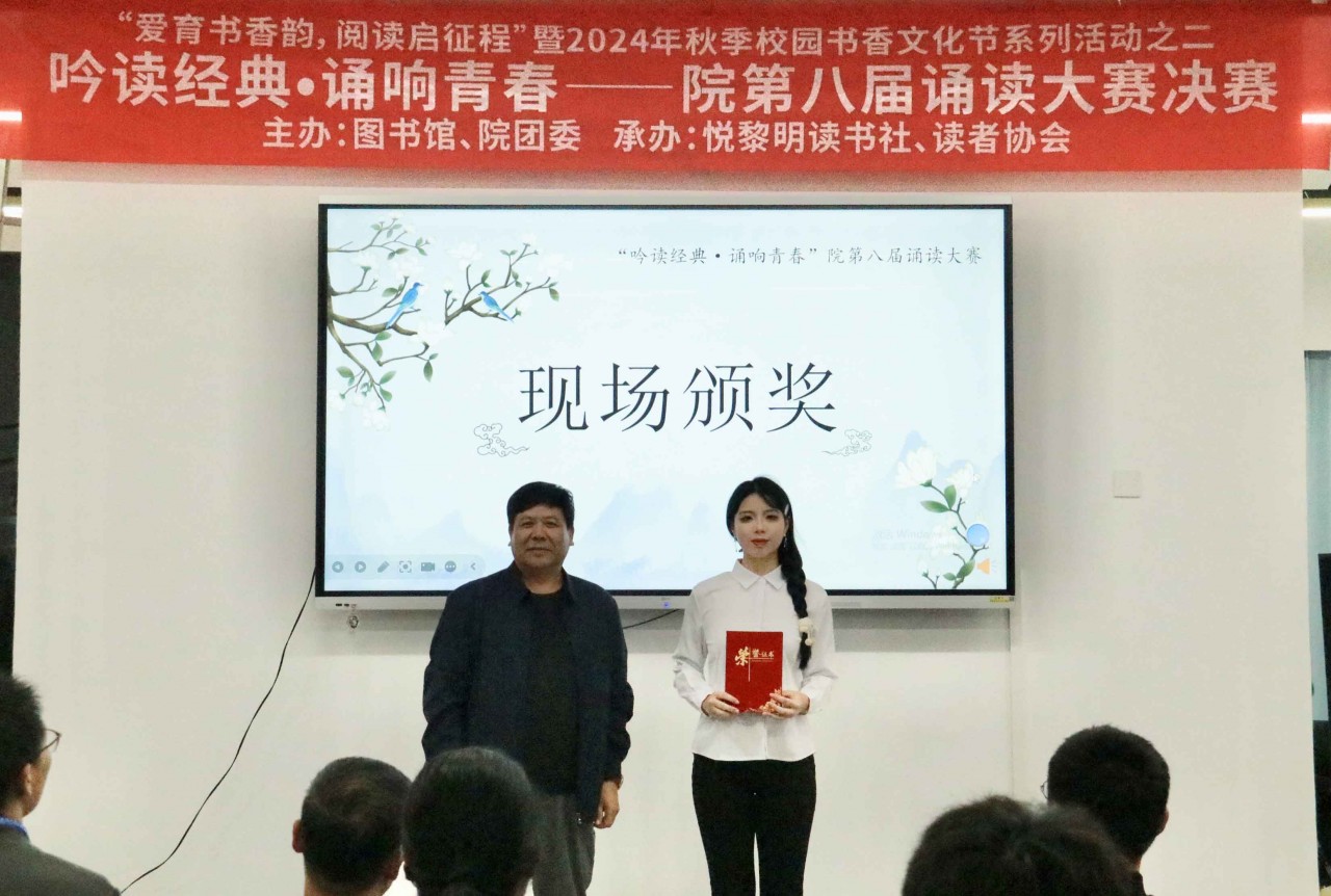 赛后,范院长讲话。他说:朗诵是品味高雅的活动,它用声音传递文学之美,用情感打动人们的心灵。图书馆年年举办朗诵活动,虽不能人人参与,但是带动了学院文化育人的气氛,也提高师生知识、文化与审美的涵养。举办书香文化活动,既提升自己,又影响周围人,意义不凡。