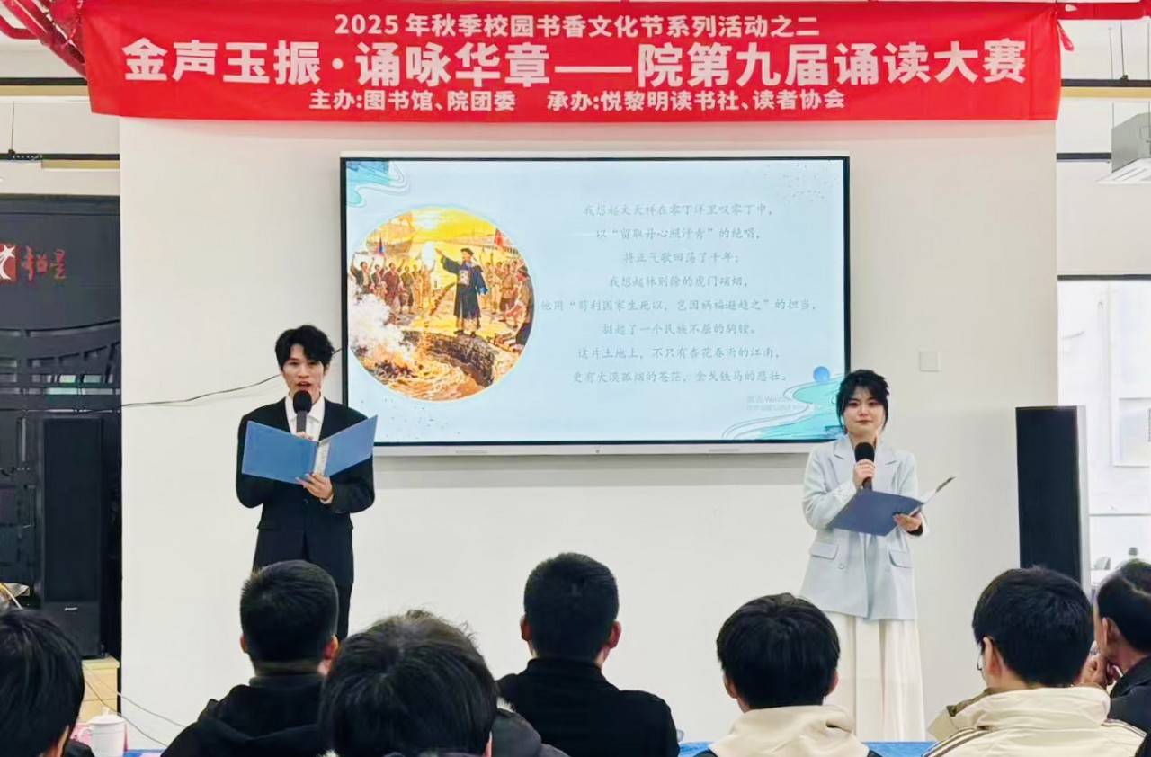 12月17日下午,由图书馆、院团委联合主办的《金声玉振•诵咏华章》——第九届校园诵读大赛决赛在图书馆隆重举行。范超峰院长、院党委廖诗忠书记等学院领导一行亲临现场,与部分处(室)负责人、参赛选手及师生代表130多人,共同观赏了这场诗意盎然的诵读盛会。
