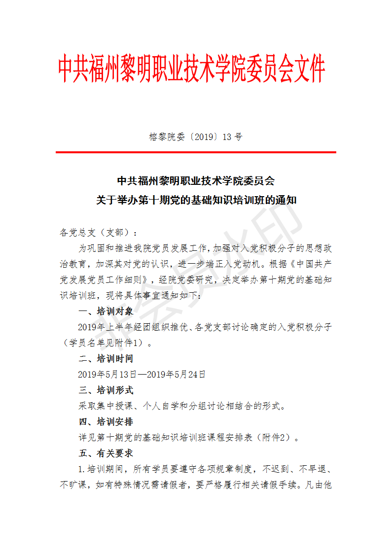 关于举办第十期党的基础知识培训班的通知