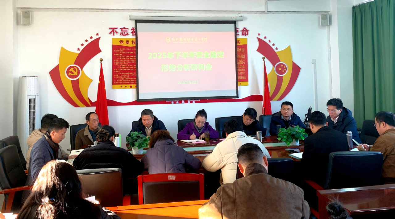 岁末年初,安全为先。为深入贯彻落实习近平总书记关于安全稳定与意识形态工作的重要指示批示精神,精准研判当前学院安全稳定与意识形态工作形势,1月8日上午,学院在地球村校区五楼会议室召开2025年下半年安全稳定形势分析研判会,学院董事长王苏华,院领导范超峰、廖诗忠、杨光舟、魏洪、王新华、肖熙、陈玉池,各处(室)、系(部)负责人、各总支(支部)书记参加会议。会议由党委副书记刘鹏主持。
