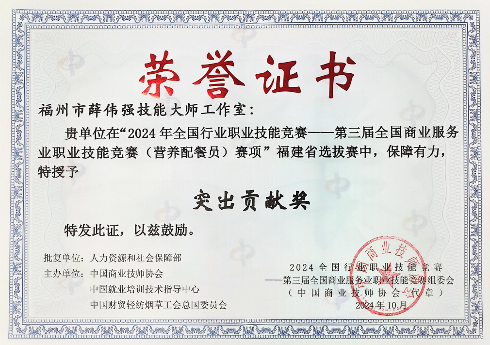 本次大赛,福州市薛伟强技能大师工作室在“2024年全国行业职业技能竞赛第三届全国商业服务业职业技能竞赛(营养配餐员)赛项”福建省选拔赛中,保障有力,被授予“突出贡献奖”。