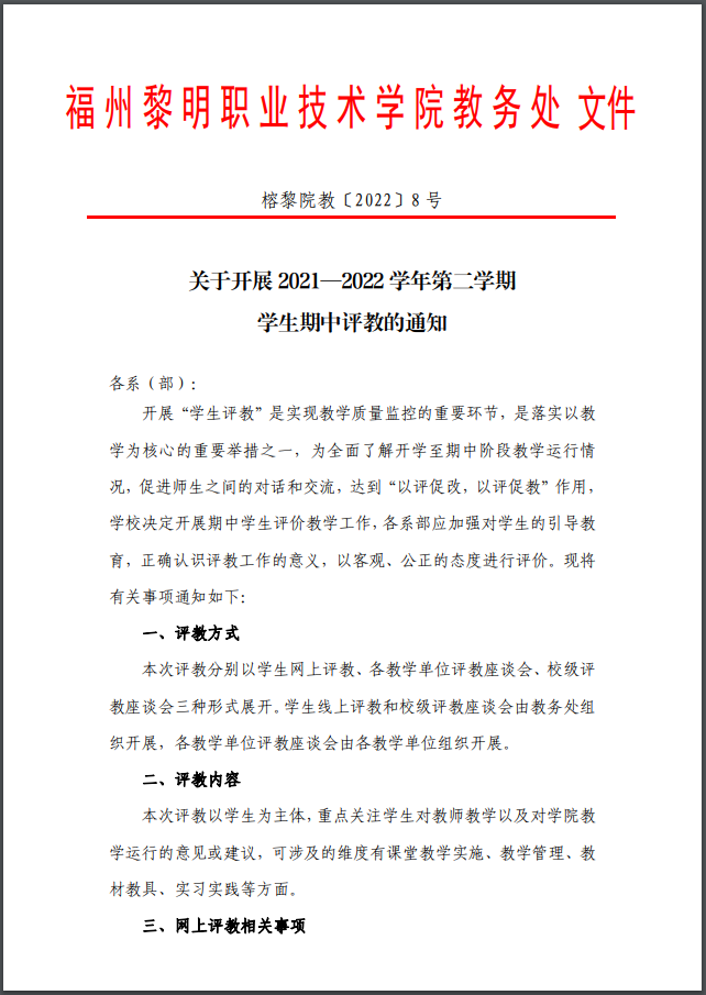 关于开展2021—2022学年第二学期学生期中评教的通知