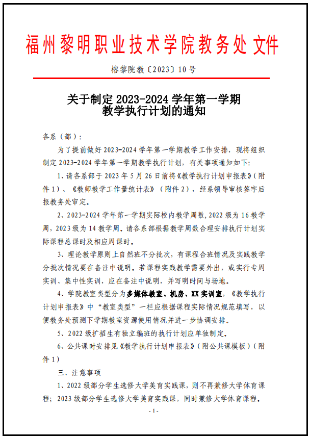 关于制定2023-2024学年第一学期 教学执行计划的通知