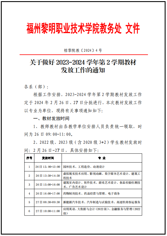 关于做好2023-2024学年第二学期教材发放工作的通知