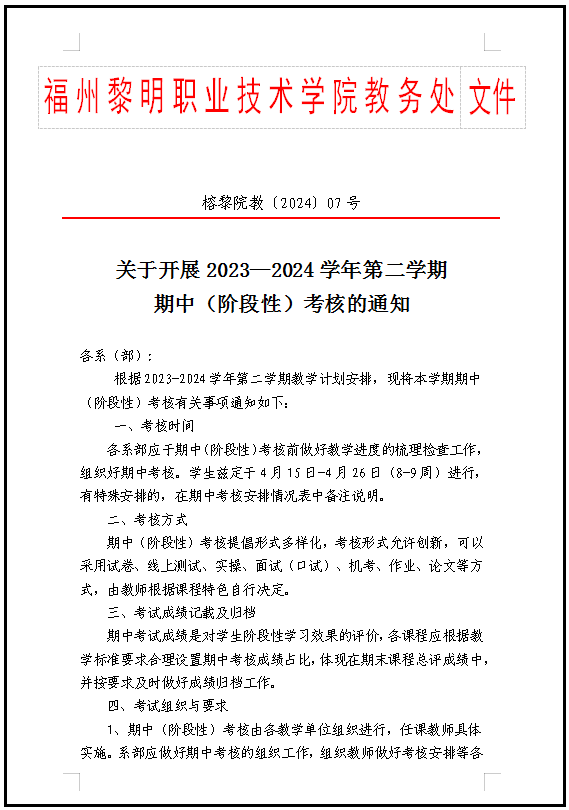 关于开展2023—2024学年第二学期期中(阶段性)考核的通知
