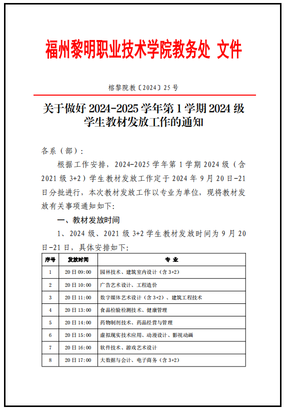 关于做好 2024-2025 学年第 1 学期 2024 级 学生教材发放工作的通知