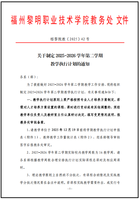 关于制定2025-2026学年第二学期教学执行计划的通知