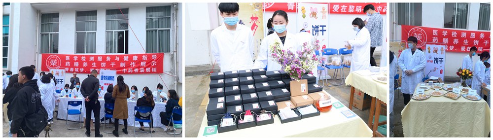 药学系结合专业特点,设置了“中药饮片识别与调配”、“医学检测服务与健康指导”、“中药香囊展销”、“药膳养生饼干制作展示”等赛项,其中 “药膳饼干”深受广大师生的喜爱,包括紫苏饼干、陈皮饼干、茯苓饼干、莲子饼干等多种药膳饼干,具有平肝健脾明目等功效;开展量血压、测血糖以及测血型等常规检测项目,既服务师生,又有利学生将所学到的知识投入到日常实践应用中。