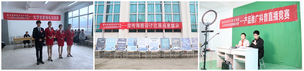 商务系设有“产品推广抖音直播大赛”、“汽车检测诊断”、“大学生职场礼仪大赛”、“网店美工制作”等多个赛项。作为今年新增设的“产品推广抖音直播大赛”,正是电商专业学生紧跟时代潮流,拥抱电商发展新变化的实践体验,以现场直播带货的形式与粉丝互动,赚足了师生的眼球;“汽车检测诊断竞赛”以汽车检测与维修技术为背景,使用“大众一汽”设置了汽车无法启动的故障,检阅了参赛队伍的组织管理、团队协作、现场问题的分析与处理、工作效率、安全及文明生产等职业素养。参赛的同学以饱满的热情,比细心,比耐心,比技巧,展现了较扎实的基本功。