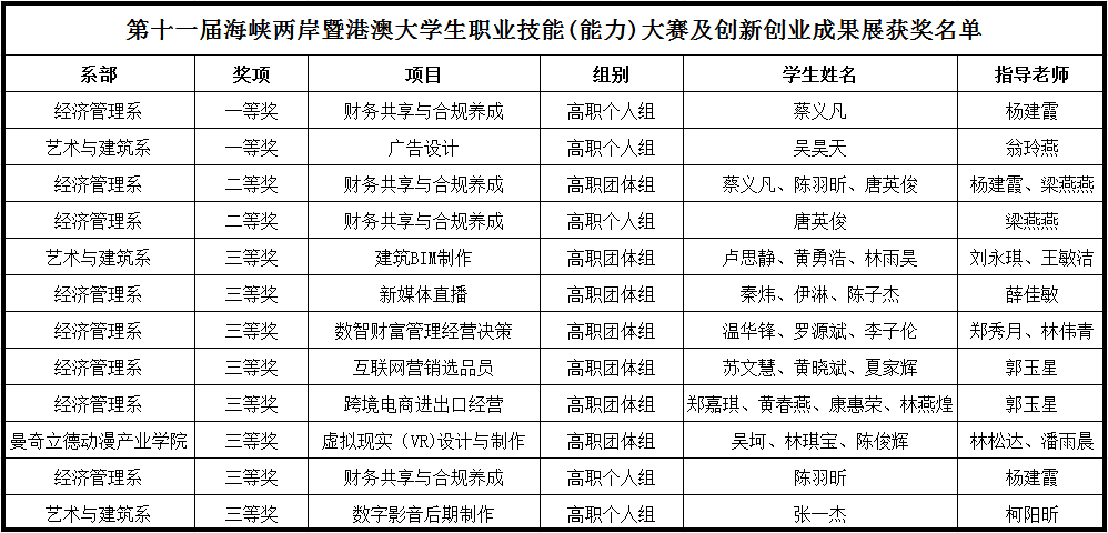近日,由福建省教育厅公布第十一届海峡两岸暨港澳大学生职业技能(能力)大赛及创新创业成果展获奖名单。我院学子在专业老师的精心指导下,凭借卓越的表现和扎实的专业技能,在众多参赛者中脱颖而出,共斩获12个奖项,其中一等奖2项、二等奖2项、三等奖8项。