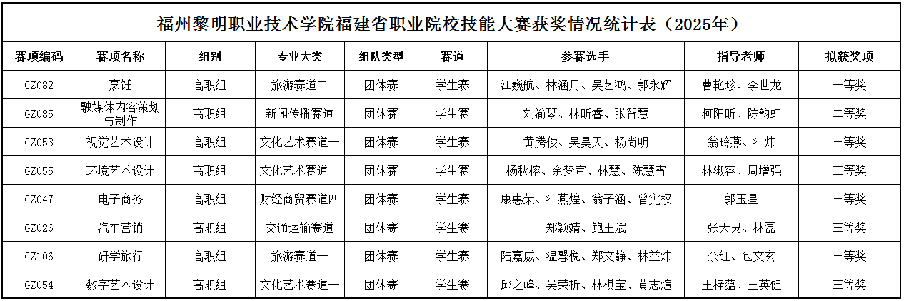 近日,历时一个半月的福建省职业院校技能大赛落下帷幕,我院学子在2025年福建省职业院校技能大赛中踔厉奋发、表现优异,共获奖项8项,其中一等奖1项,二等奖1项,三等奖6项。