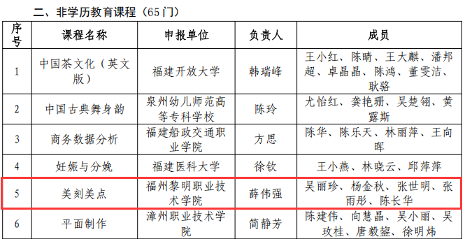 近日,福建省终身教育公共服务平台公示了2025年省级继续教育数字化精品课程拟认定名单,根据《福建省终身教育促进委员会关于开展福建省终身教育提质培优项目建设工作(2022-2025年)的通知》及《福建省教育厅关于开展2025年省级职业教育与终身教育重点建设项目申报工作的通知》,经单位、个人申报,专家评审,我校薛伟强老师负责的《美刻美点》、欧志亮老师负责的《网店运营推广》两门课程2门课程入选2025年省级继续教育数字化精品课程。