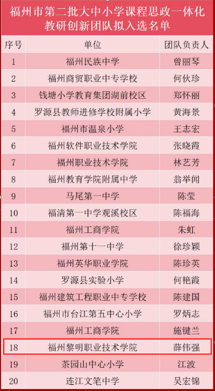 福州教育研究院发布《关于福州市第二批大中小学课程思政一体化教研创新团队拟入选名单的公示》,我校薛伟强老师带领的教研创新团队成功入选福州市第二批大中小学课程思政一体化教研创新团队。