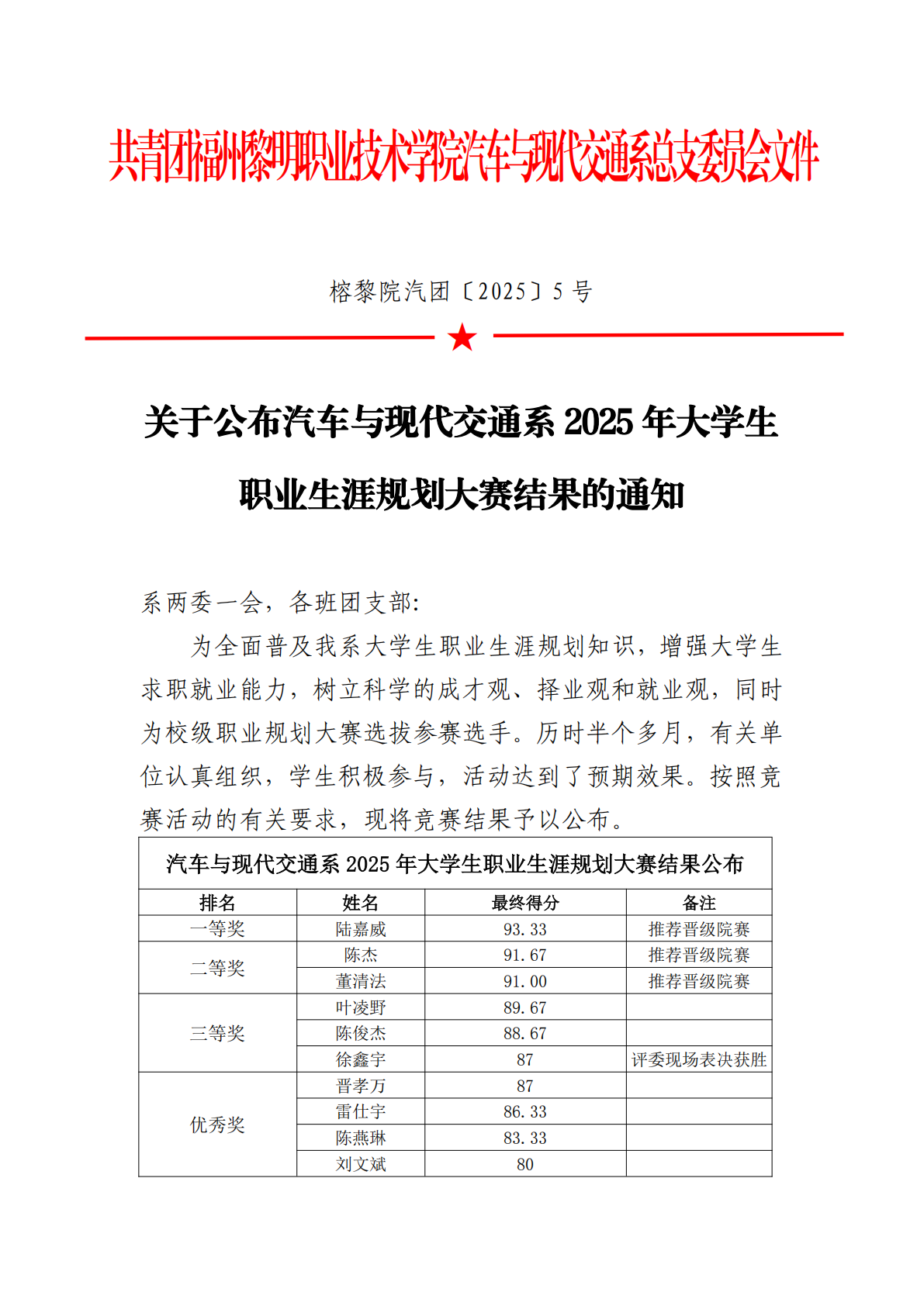 关于公布汽车与现代交通系 2025 年大学生 职业生涯规划大赛结果的通知