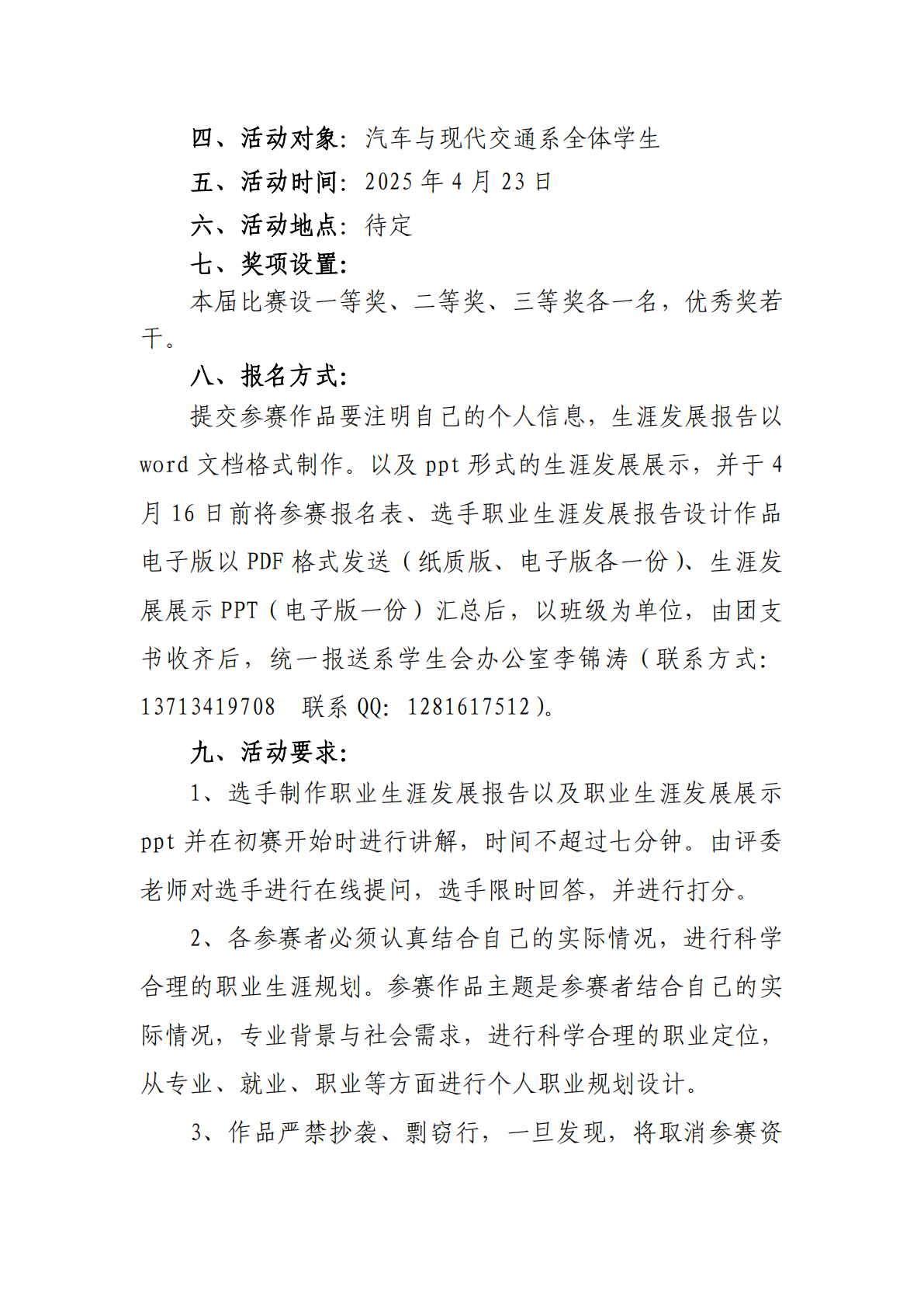 关于举办汽车与现代交通系 2025 年大学生 职业生涯规划大赛通知