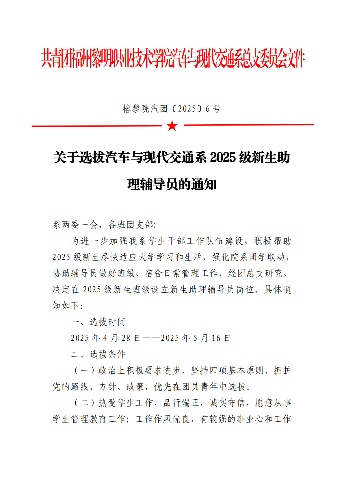 关于选拔汽车与现代交通系 2025 级新生助 理辅导员的通知