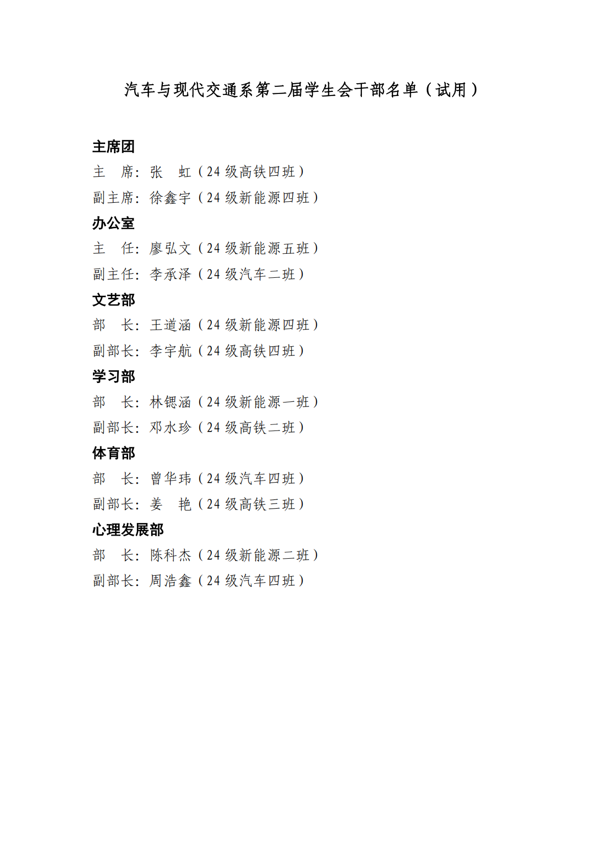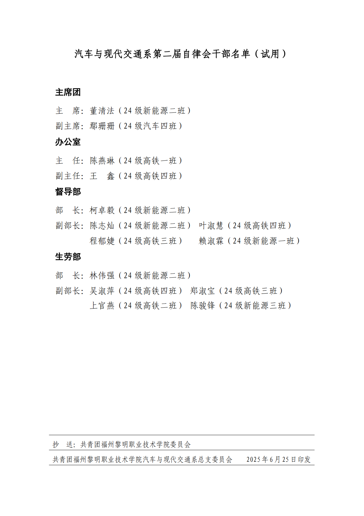 关于印发《福州黎明职业技术学院汽车与现 代交通系第二届学生干部任职名单(试用)》 的通知