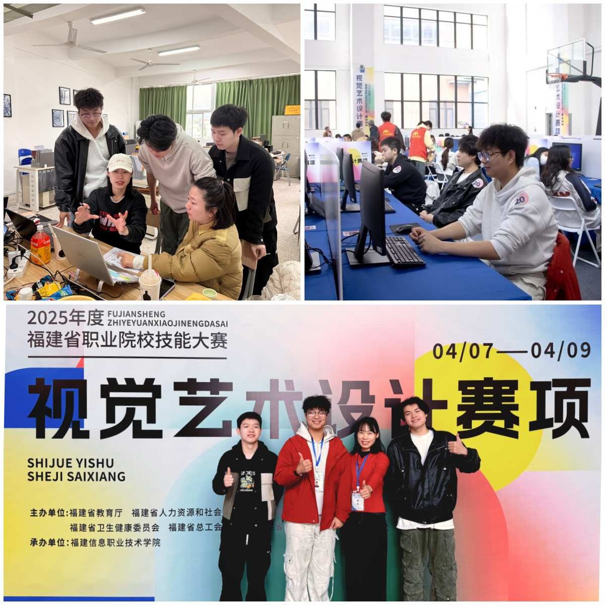 2025年4月9日,由福建省教育厅、福建省人力资源和社会保障厅、福建省财政厅等8部门联合主办的福建省职业院校技能大赛“视觉艺术设计赛项”在福建信息职业技术学院圆满落幕。本次大赛吸引了全省40支代表队、120名学生参赛,竞争异常激烈。其中我系翁玲燕、江炜两名老师指导的23级广告1班黄腾俊、23级广告2班吴昊天、杨尚明三名同学凭借扎实的专业功底荣获三等奖的佳绩。