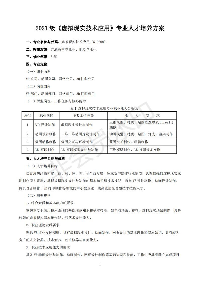 2021级虚拟现实技术应用专业人才培养方案