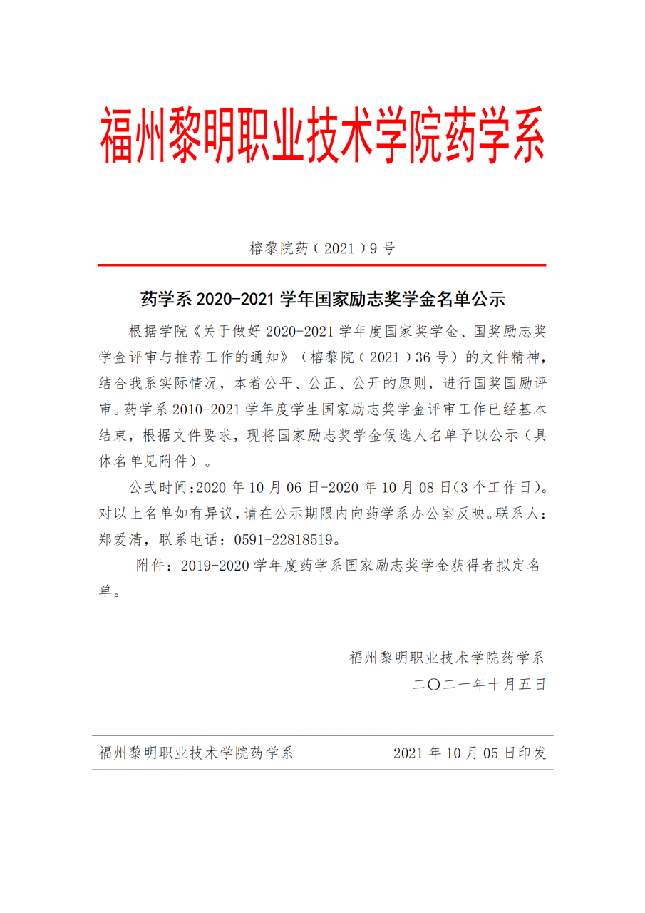药学系2020-2021学年国家励志奖学金名单公示
