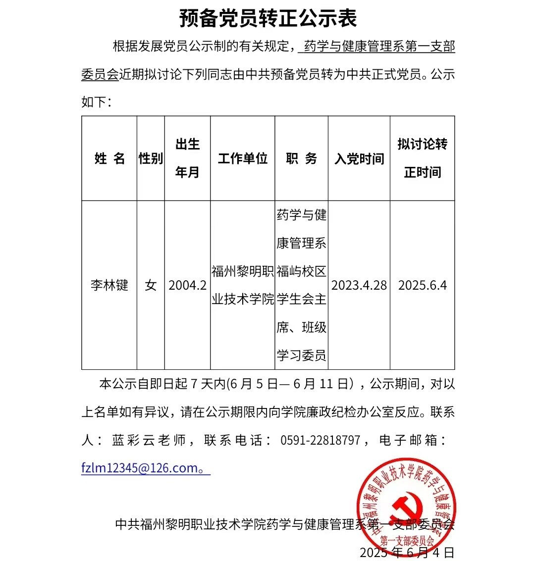 药学与健康管理系第一支部委员会预备党员转正公示表