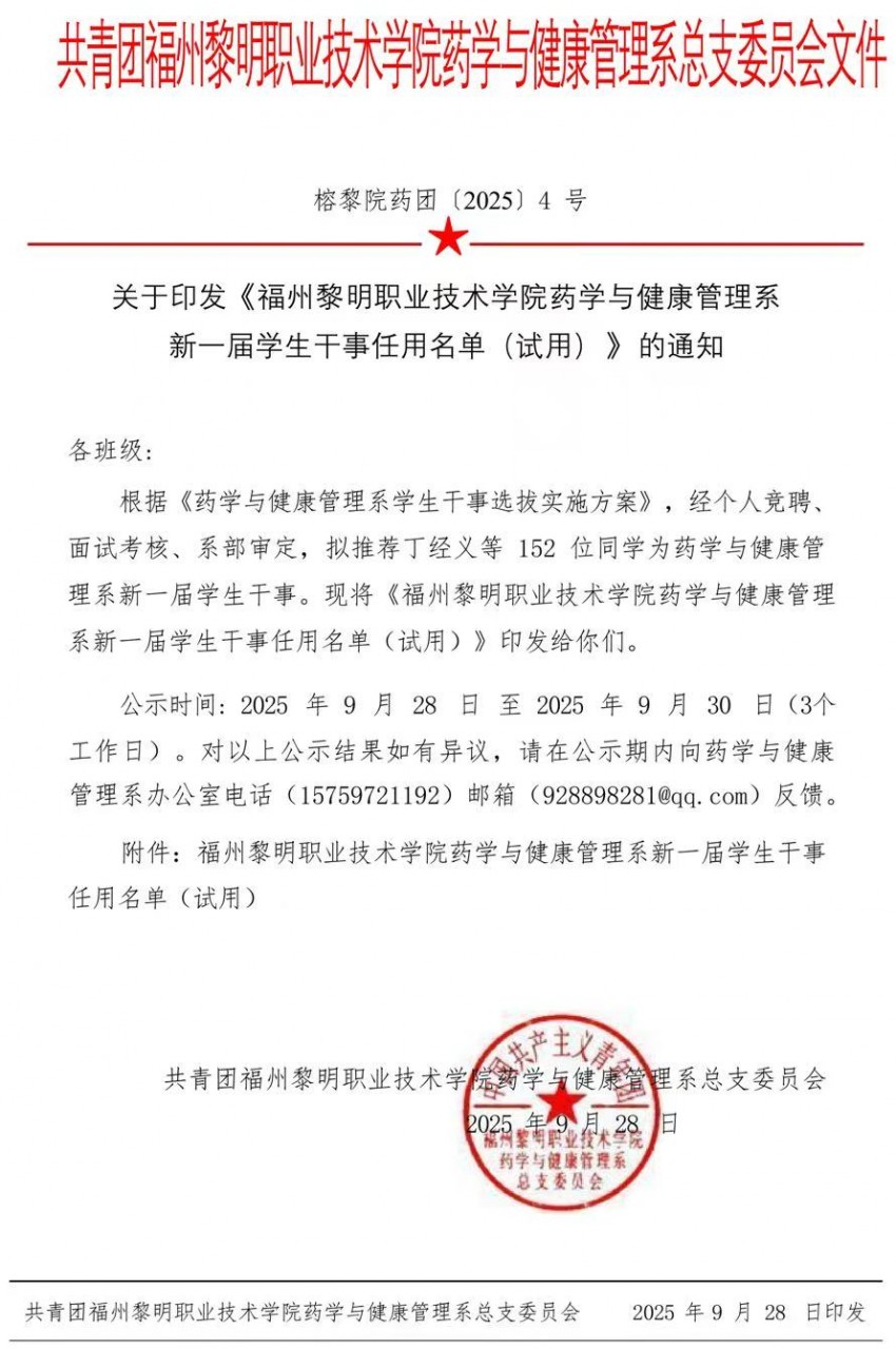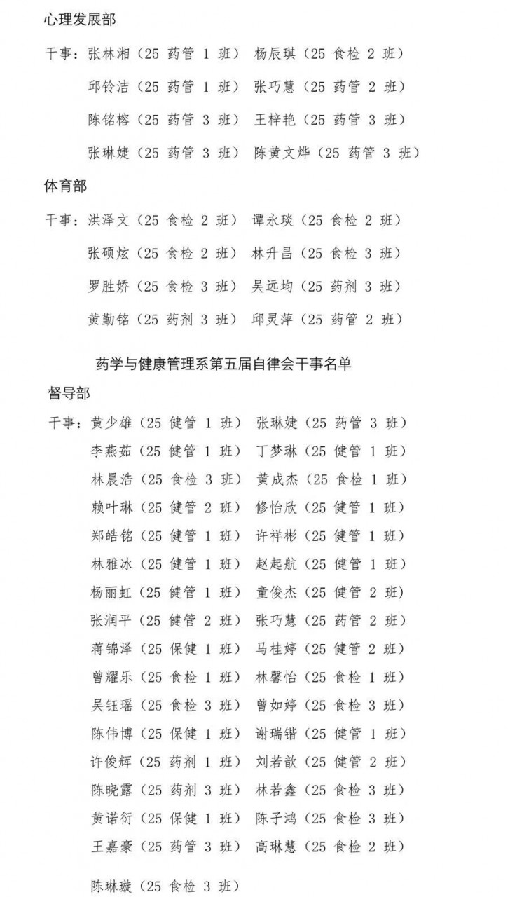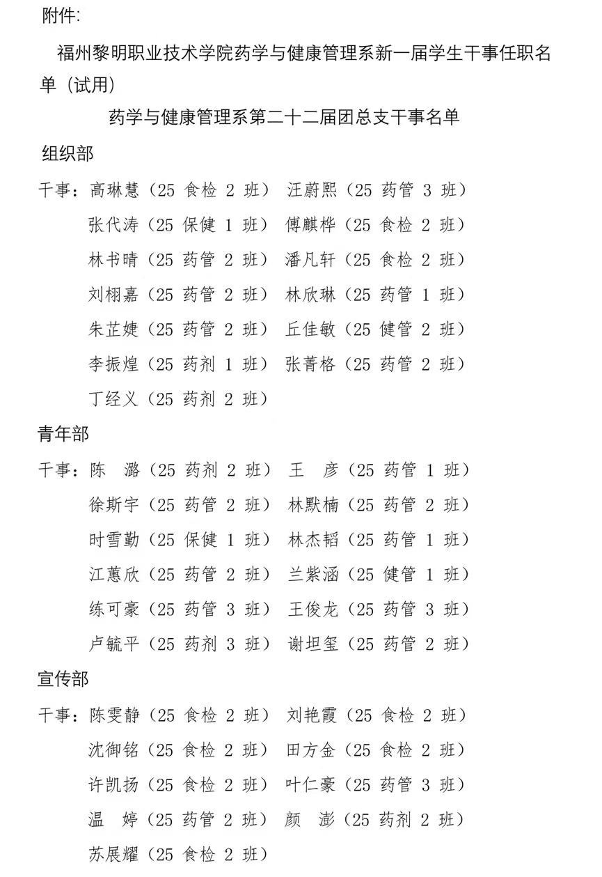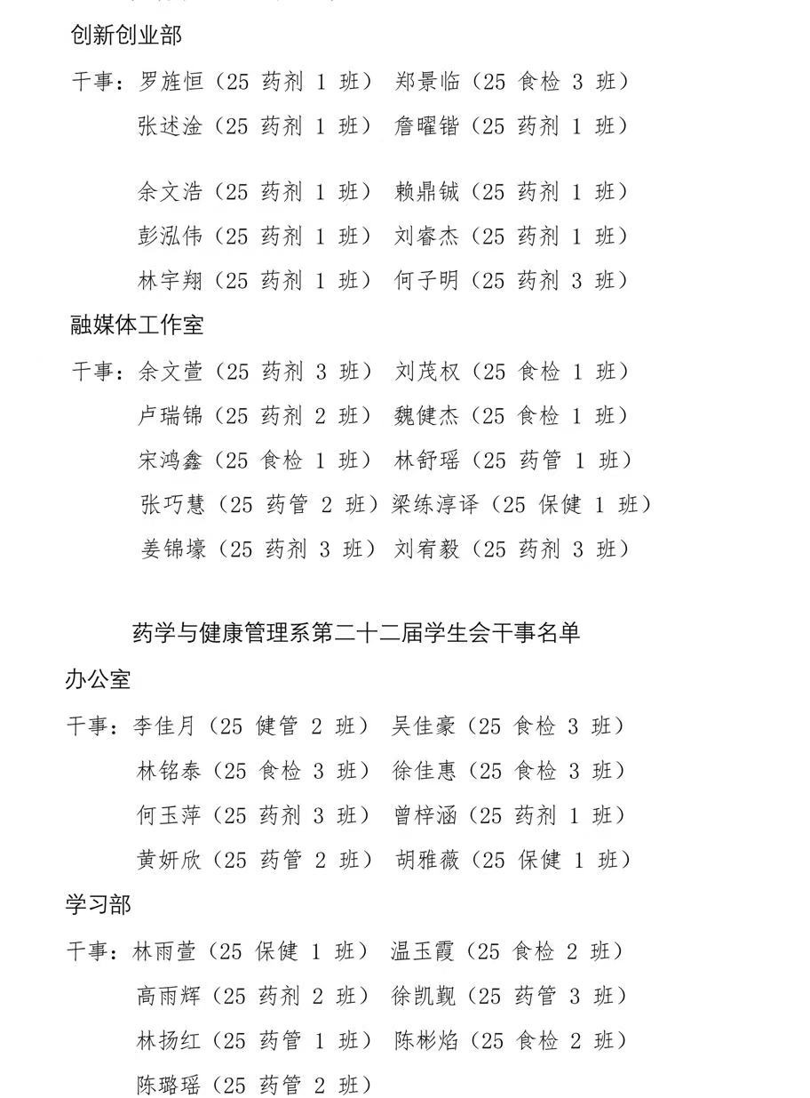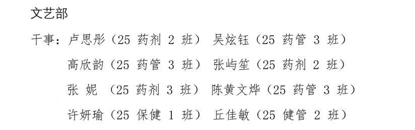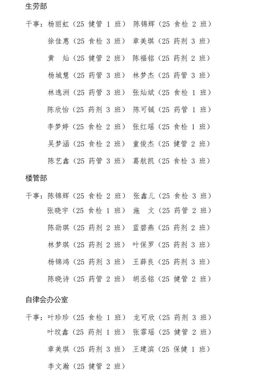 榕黎院药团〔2025〕关于新一届系学生干事名单