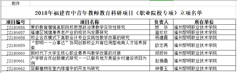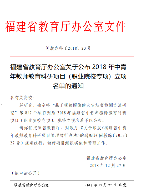 根据《福建省教育厅办公室关于公布2018年度中青年教师教育科研项目(职业院校专项)立项名单的通知》(闽教办科〔2018〕23号)文件精神,我院思政部樊华等7位教师的2018年度中青年教师教育科研项目(职业院校专项)批准立项。请获立项老师按上级规定,做好项目组织实施和管理工作。
