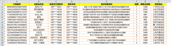 提示学生:刚才的源数据表已经涉及买家相关隐私信息(会员名、支付宝账号、手机号、联系地址等)。跟学生解释,这个实验所用的素材虽然有涉及隐私,但这个数据是从卖家淘宝平台上合法导出来的,而且数据做了脱敏处理,去除了较为敏感的信息,所以大家可以大胆的用来做实验。