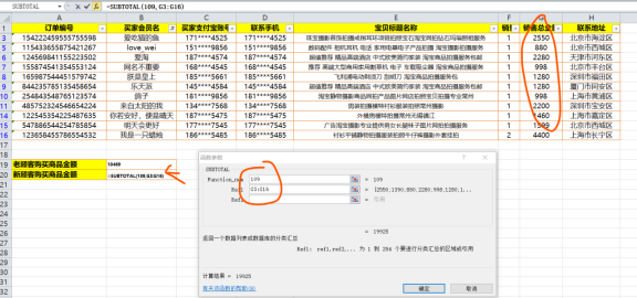 Step03:在B19单元格中,使用SUMTOTAL函数计算“老顾客的购买商品金额”。如图: