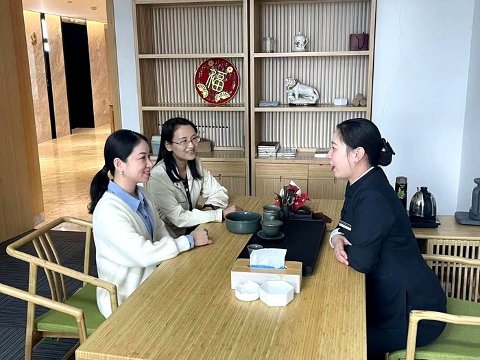 在梅园酒店负责人的陪同下,两位教师详细了解了酒店的管理体系以及员工培养机制,并就校企合作、人才培养等议题进行了深入交流。