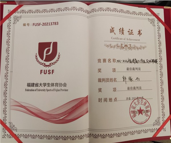 这是郭家兴同学第一次参加这种大型的省级联赛的裁判员工作,郭家兴同学课余时间也在福州市参加各类的校园联赛等比赛的裁判员工作。在本次的大学生足球联赛中,郭家兴同学表现优异,出生于2003年的他在场上动作的规范、位置选择好、判罚准确性高,以及其工作认真严谨的态度让裁委会的委员们对他的评价有着一致好评,得到了裁判前辈的表扬和运动队的认可。同时本次活动他获得了了2021届林业碳中和杯福建省大学生足球联赛中“最佳裁判员”的荣誉证书及称号。