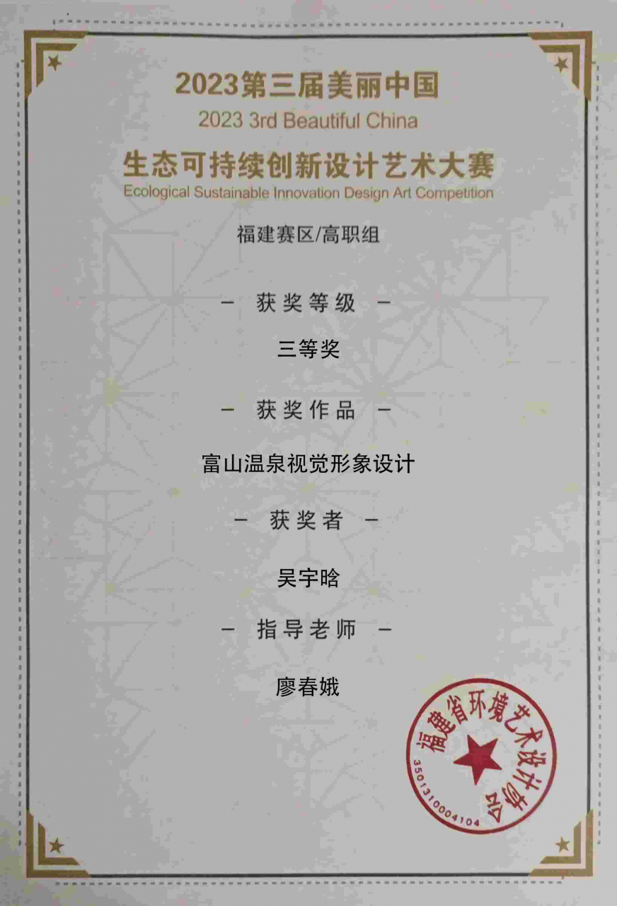 近日,由福建省美术家协会、福建省环境艺术设计协会主办的2023年第三届美丽中国生态可持续创新设计艺术大赛圆满落幕,祝贺我系廖春娥老师带领学生吴宇晗荣获三等奖的好成绩。