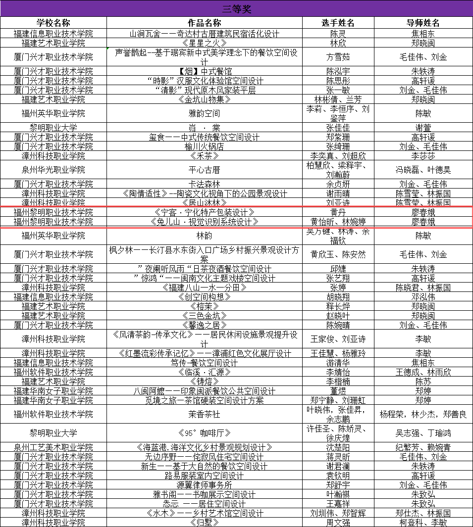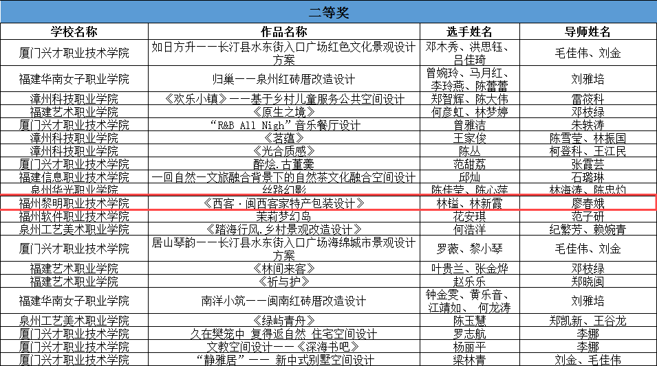 近日,由福建省美术家协会、福建省环境艺术设计协会主办的2024年第四届“美丽中国 茉莉花开”生态可持续创新艺术设计大赛圆满落幕。我系广告艺术设计专业廖春娥老师指导的四项作品参加本次大赛,分别是:22级广告2班林镒、林新霞的作品《西客·闽西客家特产包装设计》获得二等奖;22级广告1班黄丹的作品《宁客·宁化特产包装设计》和黄怡昕、林婉婷的作品《兔儿山·视觉识别系统设计》获得三等奖;22级广告2班林新霞的作品《福州市动物园·视觉识别系统设计》获得优秀奖。