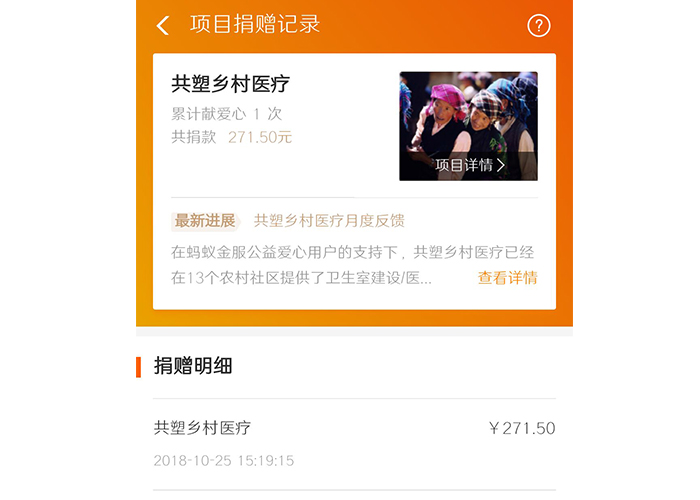 最后我们将本次义卖物品所得的总收入271.5元通过爱心平台捐献偏远山区需要医疗设备的人们——“共塑乡村医疗”,虽然不多也但也献出了自己微薄之力,我们希望我们的善款也能帮助他们拥有一个设备齐全干净整洁的卫生所。