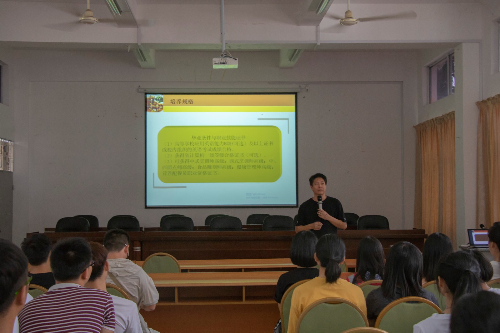 烹饪系全体老师如数出席,我院办公室主任肖熙也受邀出席。由烹饪系党支部书记陈铭帅主持,介绍了出席的各位领导和老师。办公室主任肖熙发表欢迎讲话。管委会主任林功凤对新生提出殷切的希望,最后烹饪系主任冯飞向所有新生致欢迎辞。见面会结束后就是烹饪系的专业介绍会。首先,办公室主任吴丽珍就2018级的专业培养方案向新生介绍了烹调工艺与营养专业的就业前景,人才培养目标,专业教师概况及各学期的重点课程安排。接下来各个专任教师向同学们具体介绍了自己的专业课程,精心制作的PPT,图文并茂,使新生对接下来所要学习的课程产生了浓厚的兴趣。最后,烹饪系主任冯飞和在座的新生们拉起了家常。讲述了烹调工艺与营养专业自建立以来的发展概况,还现身说法,说起自己大学的求学之路,引起了同学们的共鸣。相信,上午的会议让新生对烹饪系有了更深刻的认识,归属感更加强烈。愿所有新生在烹饪系都能如鱼得水,更上一层楼。