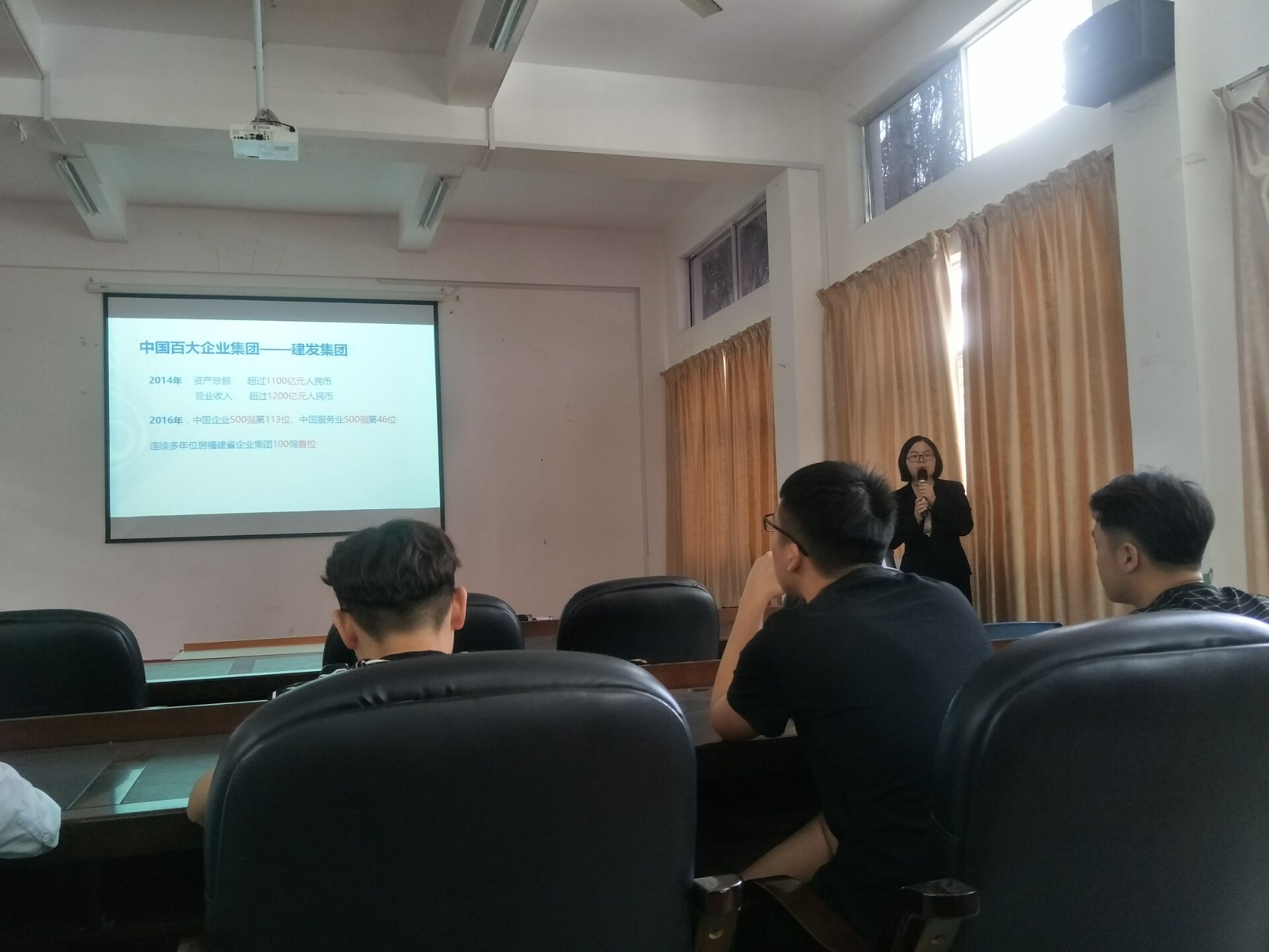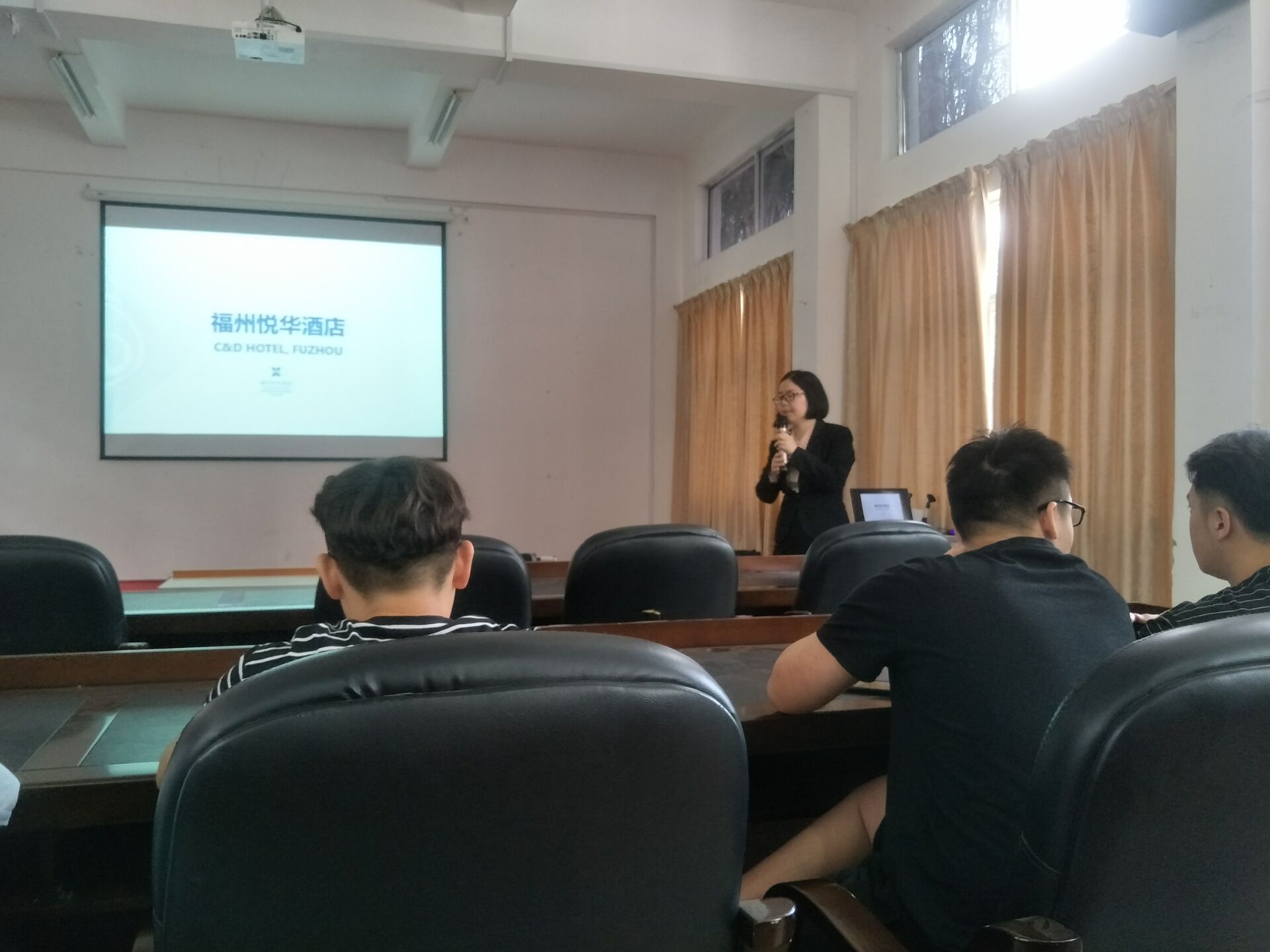 福州悦华酒店属于中国百大企业集团的建发集团的一部分。公司秉承建发旅游集团“悦华”品牌独特的东方式专业温馨服务理念,以及“事业留人,环境留人,待遇留人,情感留人”的才华培养宗旨,为员工提供专业的岗位技能培训及广阔的职业晋升空间。首先,人力资源部揭才华女士介绍了酒店的基本情况,招聘岗位以及入职后的岗位职责,实习生福利等。随后揭才华女士又给在场的同学们分享了在择业上的建议,要知道自己想从事哪一方面工作,然后针对性地进行学习,在找工作时,要自信,总之,不能辜负青春!