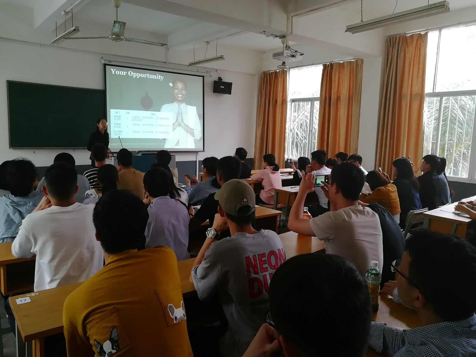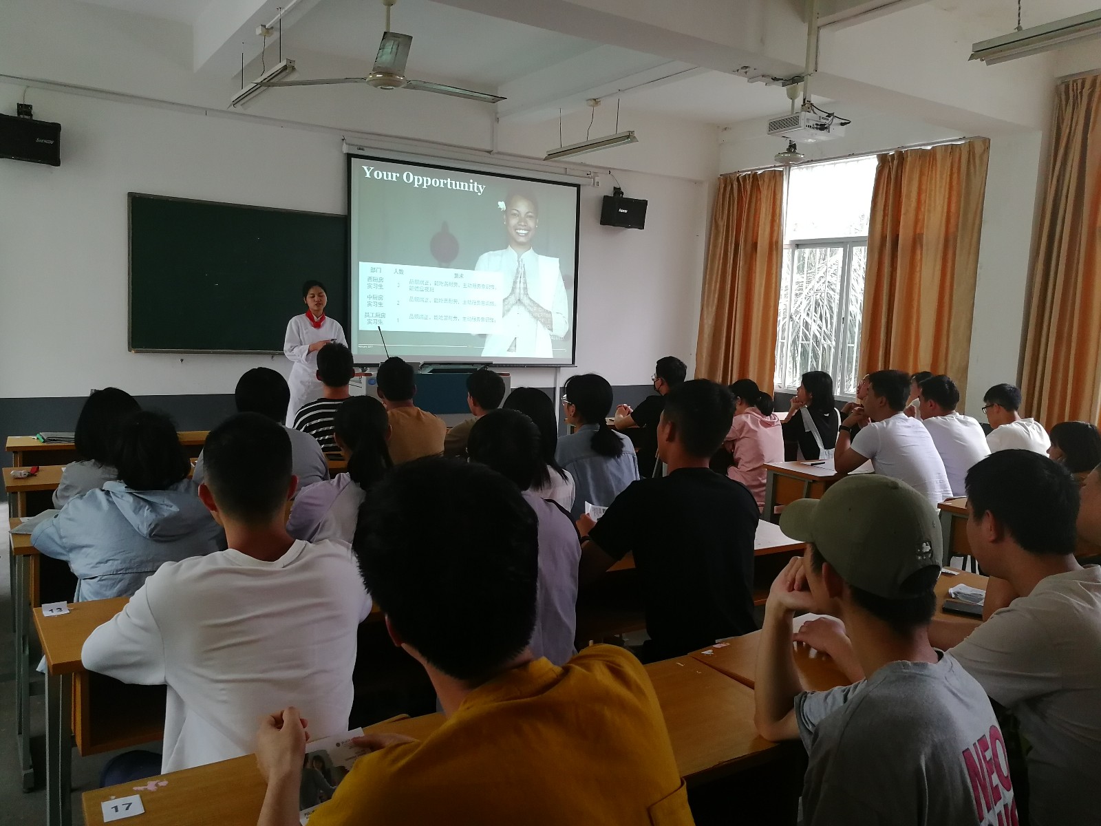 福州泰禾铂尔曼酒店人事部经理通过幽默风趣的语言介绍了该酒店的企业概况、企业文化、员工福利,岗位需求以及薪资待遇等内容。现场同学们认真聆听,时不时给予掌声回应。现场同学们纷纷举手提问关心的问题,两企业的HR都相应详细的回答。会后,十几位同学提交了简历,现场经理对同学们进行了一个简短的面试。HR们表示,烹饪系的同学们很热情,希望能够有长期地合作。